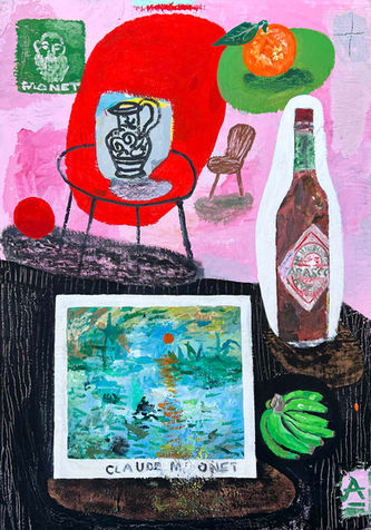 Régis' creations spring from an extensive digital image archive, where she meticulously assembles compositions that blend objects, edibles, flora, and figures into a tumultuous symphony. Her artistic collages capture fleeting, 'in-between' moments of daily life - the brief pauses and quick glimpses that mark our existence in an ever-accelerating world. These snapshots, drawn from lived experience or borrowed sources, seize the essence of transitory moments and instill them with permanence.