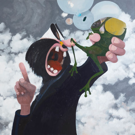 Besides the graphic design background, Terliksiz's catalysts include video games and digital culture cross-sections, Robert Crumb's comics, old Disney or Max Fleischer cartoon scene drawings, as well as oeuvres and concepts developed by the likes of Picasso, Guston, or Condo. Such a varied range of influences reveals itself in the ways the scenes and perspectives are laid out, in the light setting swathing the scenery, or the ways that characters' faces are disrupted with a Cubist-like precision and attitude, and even the title of the show turned out to be a coincidental nod to Crumb. But what wasn't a coincidence was that such a blend of elements happened in the studio located on the historical bridge between Europe and Asia. Stimulated by the eclectic mix of cultural identities and socio-economic extremes, Terliksiz allowed for the liveliness of his creativity to flow, shapeshift, and expand, "paintgenireeing" his implausible yet captivating world along the way.