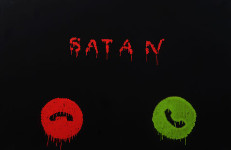 The tone becomes even more direct and symbolic in Mateusz Sarzynski’s paintings, where the demon takes the form of ritual signs, pentagrams, dark dances, and defiled pop icons. His painting is brutal, exaggerated, almost childlike in its over-the-top theatricality. Sarzynski doesn’t celebrate the occult; he empties it, exposing how fear itself can become grotesque, even familiar. In these three cases, the demon is visible, shouted, embodied. Elsewhere, it dissolves, fragments, and disperses.